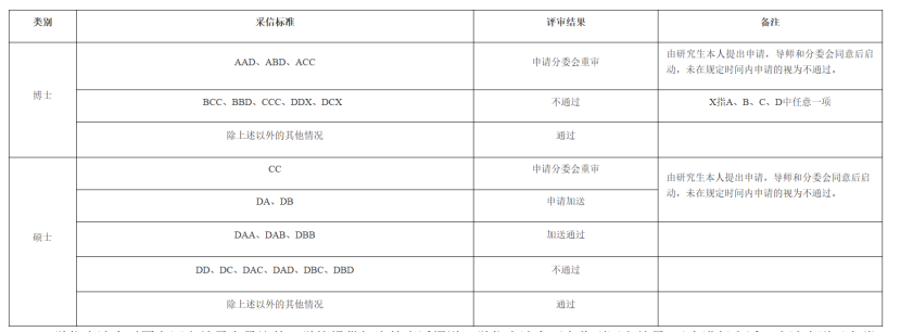 其中博士学位论文匿名评审结果为“AAD”“ABD”或“ACC”,硕士学位论文匿名评审结果为“CC”,经研究生本人申请、导师和学院分委会同意,可申请分委会重审,重审步骤和要求由各学院自定并报研究生院备案;硕士学位论文匿名评审结果为“DA”或“DB”的,经研究生本人申请、导师和学院分委会同意,可申请继续加送1份,不得修改论文,不得继续送审原评审专家。